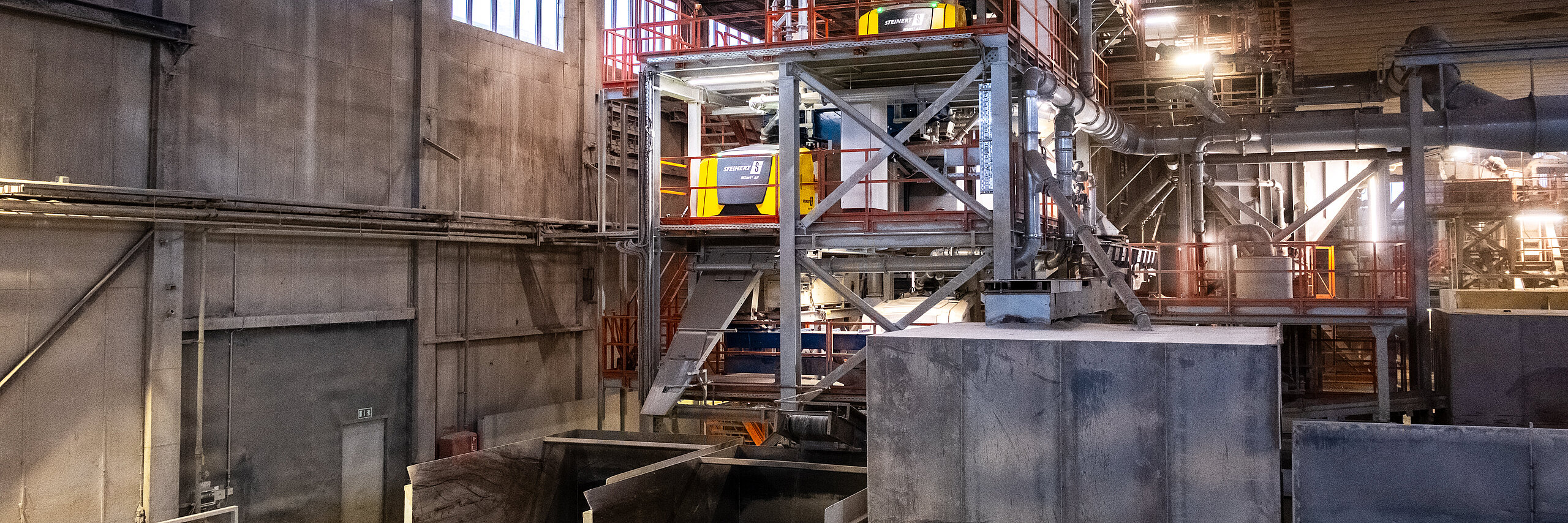Mas, afinal, o que é a classificação ótica? Os sensores "vêem" através da luz, verificando se esta consegue penetrar no vidro. Se a luz não passar, significa que se trata de um material indesejado, como KSP (cerâmica, pedras ou porcelana). Se for metal, o sensor de metal identifica-o. Jatos de ar separam então o material classificado A do material classificado B. A linha de recuperação consiste numa classificação fina e numa classificação grossa. Na classificação grossa, são utilizados vários sistemas de classificação MSort de diferentes gerações. Na Fines Line, que separa fragmentos com um tamanho entre os 4 e os 10 mm, estão agora instalados os sistemas mais recentes com o design amarelo da STEINERT: MSort AF (Rougher Stage) e MSort AK (Cleaner Stage). Na linha destinada a fragmentos com dimensões entre os 10 e os 60 mm, o MSort AX está em funcionamento desde 2014. Após a remoção das impurezas, segue-se a classificação por cor. No final da linha de classificação, obtêm-se vidro marrom, vidro branco e vidro verde puros.